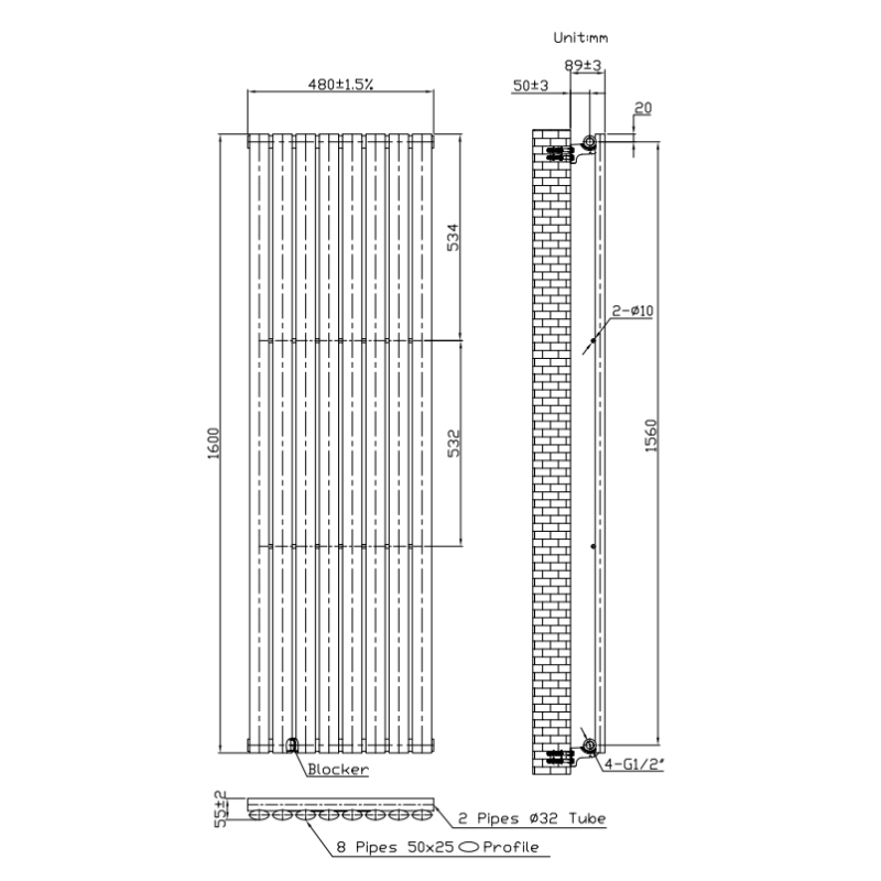 Wall to Pipe Centre (mm)53Height (mm) x Width (mm)1600x480