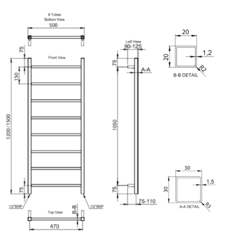 | Wall to Pipe Centre (mm) | N/A | Height (mm) x Width (mm) | 1500x500 |