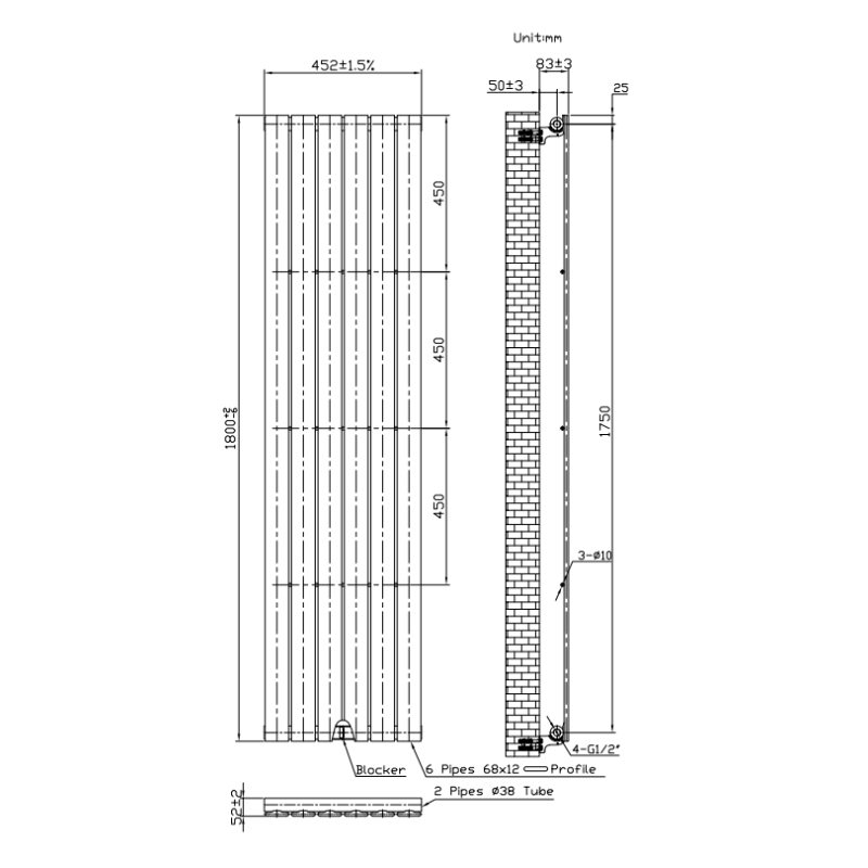 Wall to Pipe Centre (mm)53Height (mm) x Width (mm)1800x452