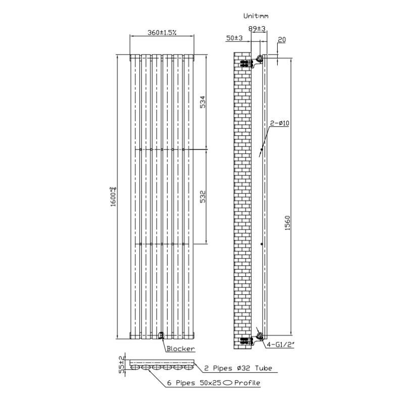 | Wall to Pipe Centre (mm) | 53 | Height (mm) x Width (mm) | 1600x360 |