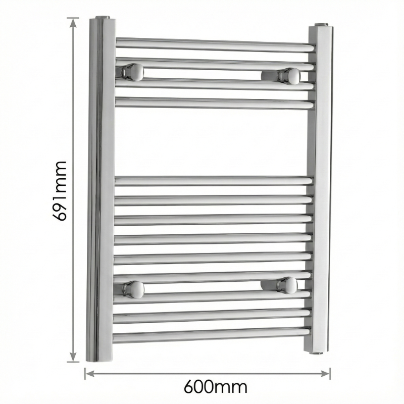 This TRH Whitstable Towel Rail features a bright chrome finish that adds a clean and reflective look to bathroom spaces With a size of 691mm height by 600mm width it fits comfortably in small to medium bathrooms This vertical designer towel rail blends well with a wide range of bathroom styles and fittings